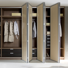 - При помощи такой двери можно создать уникальный дизайн шкафа-купе. Его можно разделить на несколько секций, каждая из которых будет открываться отдельно.